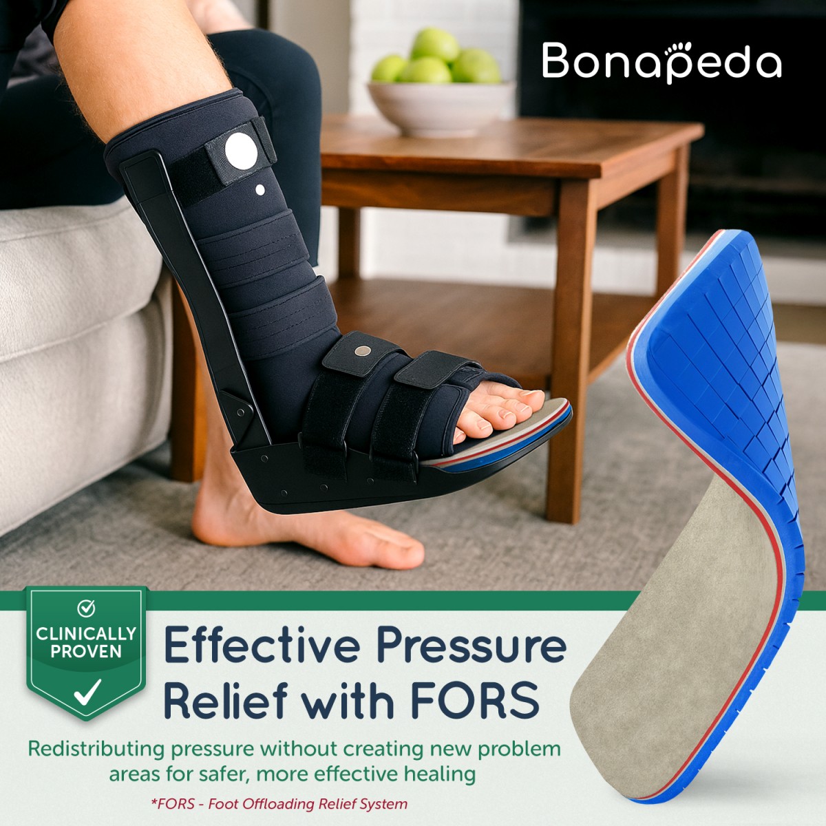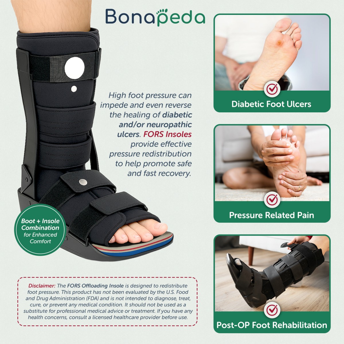 DISCLAIMER:  THE FORS OFFLOADING INSOLE HAS NOT BEEN EVALUATED BY THE U.S. FOOD AND DRUG ADMINISTRATION (FDA). The FORS Offloading Insole is designed to selectively redistribute foot pressures. This product is not intended to diagnose, treat, cure, or prevent any medical condition. It should not be used as a substitute for professional medical advice or treatment. If you have any health concerns, consult a licensed healthcare provider before use.