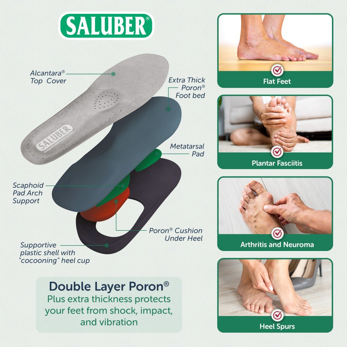 • Cocooning heel with Poron® antishock insert helps maintain correct posture, absorbs vibration, and softens the impact of the heel on the ground.